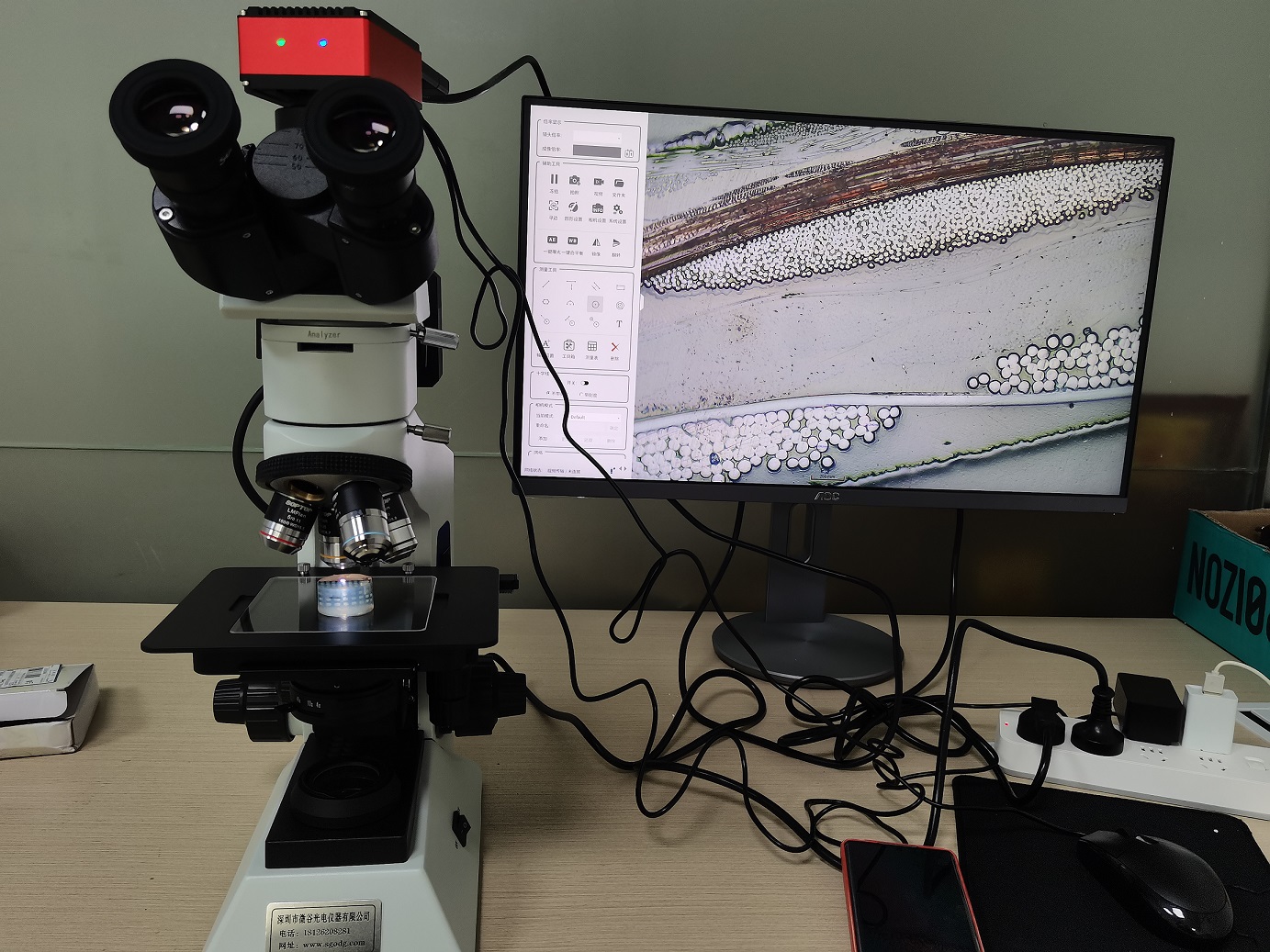 產品材料經過切片并進行磨拋、拋光使得產品表面平整后,再用研究級金相顯微鏡進行放大觀測并拍照存儲及測量的操作等等